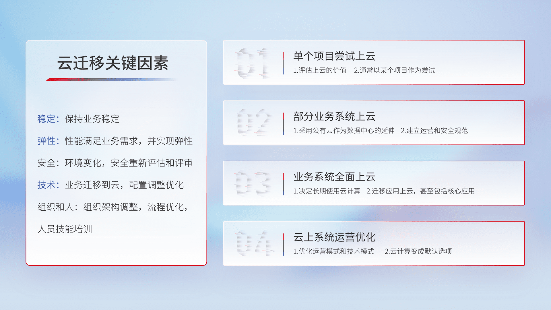 结合实际业务,,,从规划设计、、、云平台选型、、、云原生改造、、数据迁移、、集成交付,,,,迁移全过程为客户识别最佳上云路径,,,,做好风险识别管理,,,,设计网络架构、、身份权限、、、安全审计合规、、、操作审计、、日志审计、、、监控告警策略、、、、多站点容灾设计等,,对云上基础设施进行整体规划,,,提升IT治理水平,,,以满足弹性、、高可用、、、高性能的需求。。。